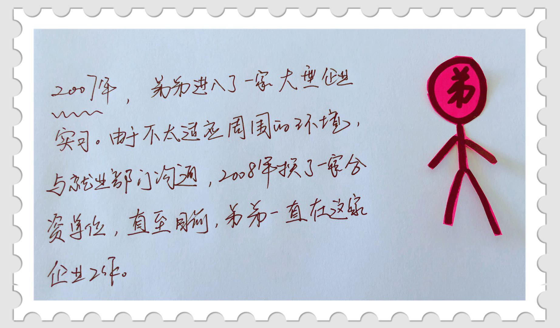2008年——弟弟不適應(yīng)企業(yè)的環(huán)境,學(xué)校再次分配到一家合資單位,直到目前,弟弟一直在這家單位工作。