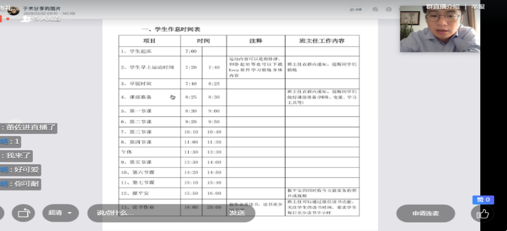 今天各班級正式開始了網(wǎng)絡(luò)直播、錄播課程的直播學(xué)習(xí)。雖然學(xué)習(xí)的地點(diǎn)不是學(xué)校的教室,班級的黑板被老師的電腦屏幕所代替。但是學(xué)生們的學(xué)習(xí)狀態(tài)一點(diǎn)也不差。早早的做好了準(zhǔn)備工作。